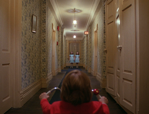 Kubrick ถ่ายทำฉากนี้โดยให้แดนนี่มองโถงทางเดินเปล่าๆ แล้วก็กำกับให้เขาตกใจ กลอกตาด้วยความกลัว ก่อนจะช็อกไป หลังจากนั้นค่อยไปถ่ายฉากเด็กผู้หญิงยืนอยู่ทีหลัง แล้วเอามาแมตช์กัน Kubrick ให้เหตุผลว่าเขาอยากให้ฉากดังกล่าวเป็นกึ่งภาพหลอนกึ่งภาพจริง เลยมีการถ่ายคนละช็อต พอเอามารวมกัน อารมณ์ภาพที่ได้จะไม่เชิงเป็นไปในทางเดียวกัน เพื่อสื่ออารมณ์สับสนและผิดปกติของฉากที่ว่านั่น